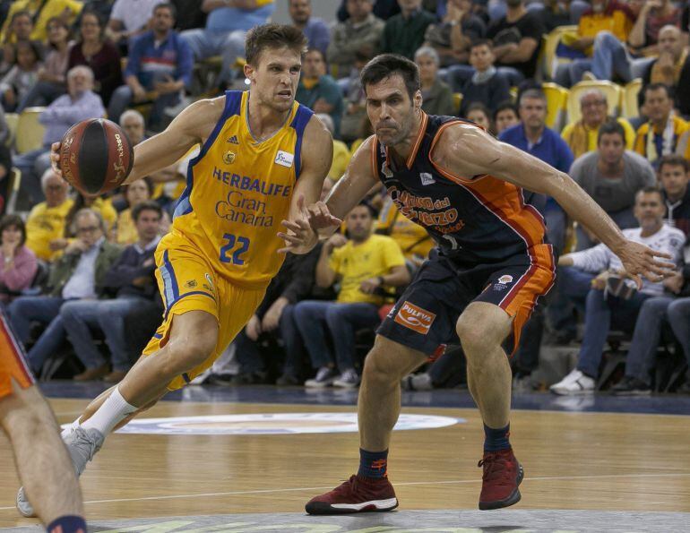 El partido arrancó con un toma y daca, con dos equipos que se jugaban la vida, especialmente el Herbalife Gran Canaria. Los amarillos se mostraban con mucha intensidad defensiva, pero Valencia Basket jugaba en estático con inteligencia y resolución. Rabaseda se convirtió en el hombre del inicio con siete puntos de los once de su equipo. El partido se preveía largo, con dos equipos bregando hombro a hombro. El Valencia tan obsesionado en parar a los buenos tiradores isleños, seguía dejando libre a Rabaseda, que aparecía por todas las posiciones de ataque, logrando un total de nueve puntos en el primer cuarto. Gracias a eso el Herbalife seguía apretando el marcador. Vidorreta rotaba a su plantilla, intentando encontrar la combinación adecuado para el despegue de su equipo. Casimiro necesitaba que apareciera Eriksson, y lo hizo con un triple en la recta final del primer cuarto, que puso la diferencia en cuatro puntos y la solicitud de tiempo muerto por parte de Vidorreta. Una vez más a través de los triples, Valencia Basket encontraba el camino más cómodo para destartalar la seguridad defensiva del Gran Canaria. El primer cuarto terminaba 22 a 21.