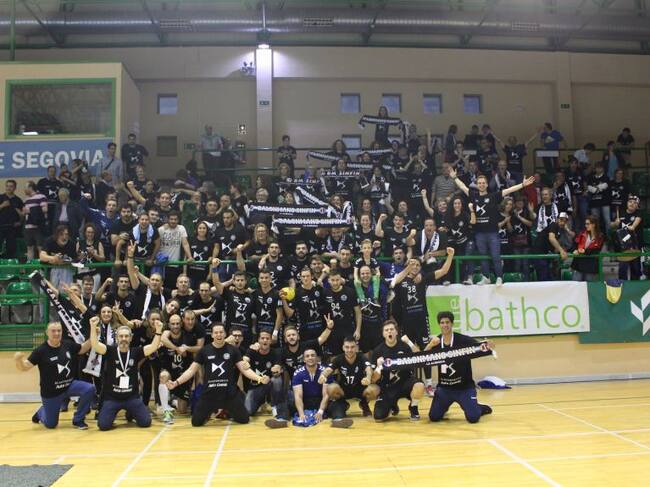 Los jguadores cántabros celebran el pase a la final junto a sus aficionados / DS Autogomas Sinfín