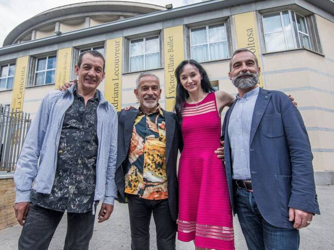 El director artístico Eduardo Lao, el coreógrafo Víctor Ullate, el gerente del teatro, Antonio Garde, y la bailarina Lucía Lacarra, que interpretará la versión actualizada de "Carmen", durante su presentación en el teatro de la Maestranza de Sevilla. / Raul Caro (EFE)