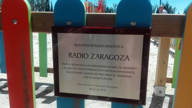 "La zona infantil del Parque de Vadorrey no se monta porque falta una pieza que no llegaba desde el 9 de ocbure. Díganos donde está la pieza, porque iremos los vecinos a buscarla. Hoy tenemos un paque sin niños". Pablo Polo, de la Asociación de Vecinos expuso esta queja al alcalde de Zaragoza. Lo hizo durante su participación en el espacio Estudio de Guardia. Hoy reconoce la labor de Radio Zaragoza como mediador, descubirendo una placa en la zona de columpios.