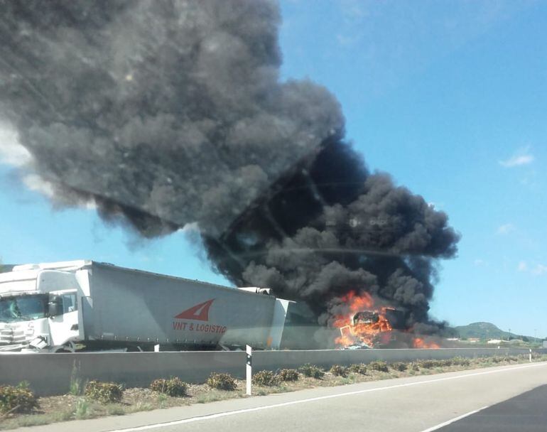 Alrededor de las cinco de la tarde ha tenido lugar un accidente de tráfico en la CV10 en el que se han visto implicados tres camiones, uno de los cuales se ha incendiado en su totalidad. Finalmente ha fallecido uno de los conductores. La columna de humo provocada por el incendio era visible desde la ciudad de Castellón