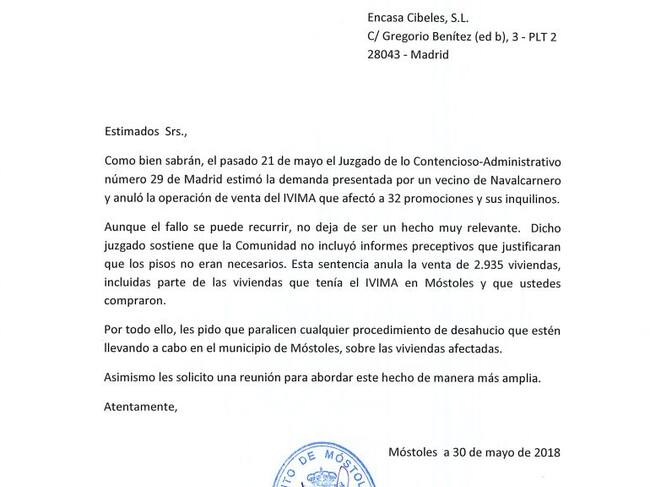 Carta del Ayuntamiento de Móstoles al fondo buitre Encasa Cibeles / Ayuntamiento de Móstoles