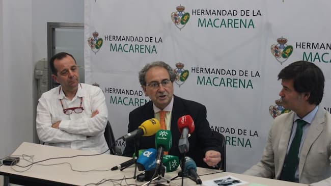 De izquierda a derecha, en la rueda de prensa de este miércoles, el arquitecto Rafael Cuadrado, el hermano mayor de La Macarena, José Antonio Fernández Cabrero; y Miguel Rus, responsable de la empresa Heliopol, que ha sido la encargada de ejecutar la obra / @Hdad_Macarena