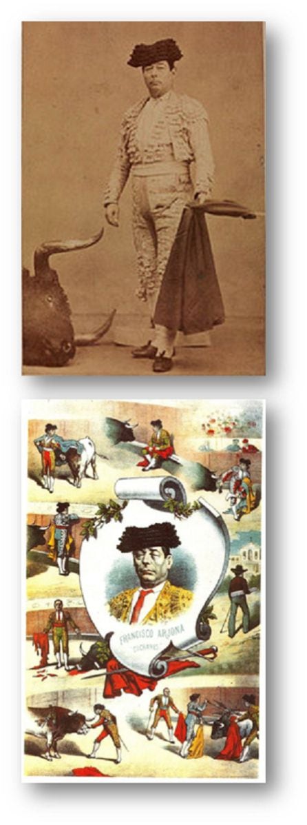 Curro Cúchares -junto a estas líneas en las láminas de La Lidia- nace, ocasionalmente, en Madrid el 20 de mayo de 1818, pues su padre Manuel Arjona 'Costuras' era un banderillero sevillano que estaba a la sazón toreando en Madrid, donde permanecían temporadas enteras, en las cuadrillas de Curro Guillén y Juan León. A todos los efectos es considerado un torero del sevillano barrio de San Bernardo, cuna de las generaciones de toreros más importantes de los siglos XVIII y XIX.