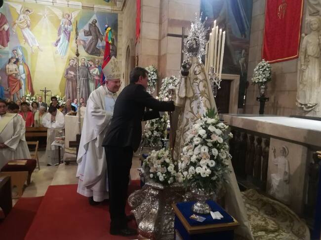 El alcalde de Linares impone el bastón de mando a la Virgen de Linarejos. / Cadena SER