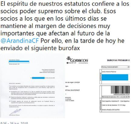 En las últimas horas algunos socios se han significado. Con nombre, apellido y número de socio abonado por delante. Sin ocultarse de nada ni de nadie. De frente, como exige el rigor del momento para dar credibilidad a las iniciativas que han emprendido. Jesús Herrero, socio número 113 de la Arandina ha escrito en su twitter que "el espíritu de nuestros estatutos confiere a los socios poder supremo sobre el club. Esos socios a los que en los últimos días se mantiene al margen de decisiones muy importantes que afectan al futuro de la Arandina. Por ello, en la tarde de hoy he enviado el siguiente burofax: Tras los últimos comunicados difundidos por el club a través de sus perfiles en redes sociales y ante la falta de transparencia sobre la composición de la Junta Directiva, ruego aclare los siguientes puntos: