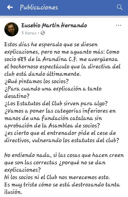 "Estos días he esperado que se diesen explicaciones, pero no me aguanto más: Como socio 483 de la Arandina C.F. me avergüenza el bochornoso espectáculo que la directiva del club está dando últimamente.