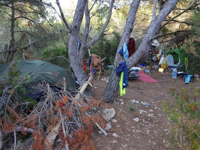 La Policía Local de Santa Eulària ha desmantelado un campamento ilegal instalado en un zona boscosa entre es Canar y Cala Nova y ha denunciado a las 9 personas que pernoctaban en las tiendas de campaña y que además, según fuentes municipales, hacían hogueras y acumulaban restos de abono y residuos de todo tipo, con el consiguiente riesgo de incendio.