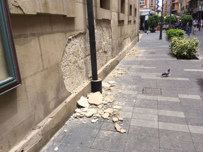 El problema de los desprendimientos en el recubrimiento que tienen esta pared lateral del Principal no es nuevo. Lo que ocurre es que tras las hogueras, son más evidentes y los cascotes se acumulaban en el suelo.