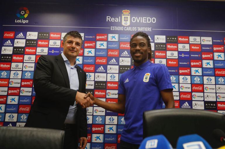 El Real Oviedo ya ha comenzado con la habitual ronda de presentaciones de cada verano. El equipo de la capital del Principado de Asturias cuenta a estas alturas con dos fichajes y ayer fue el turno de Richard Boateng. El ghanés pasó por la sala de prensa del Carlos Tartiere, junto al director de relaciones institucionales del club César Martín, y agradeció al club darle la oportunidad de jugar en Segunda División.