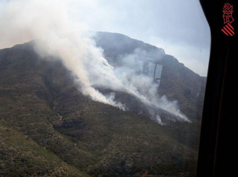 El foco de las llamas se localizó el pasado domingo en torno de la Cova del Camell a las 15.50 horas. En un primer momento, hasta nueve medios aéreos y otras nueve dotaciones por tierra de la Generalitat y de la Diputación de Alicante se movilizaron para trabajar en las labores de extinción.