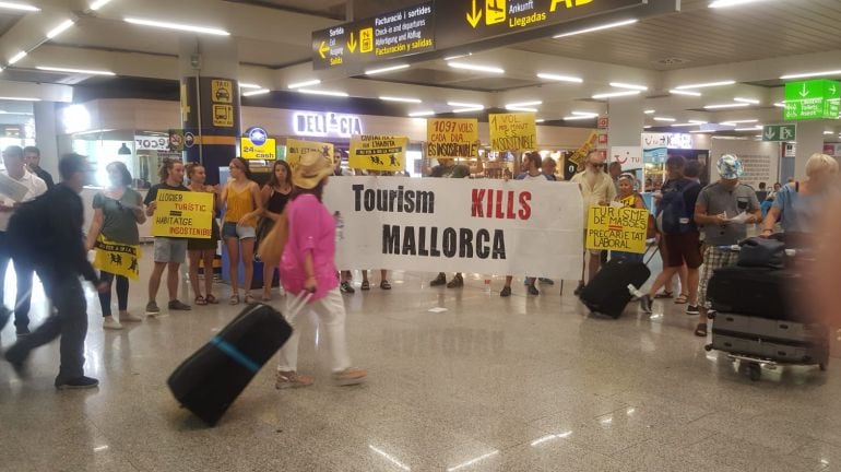 Un grupo de representantes de los colectivos Arran y Ciutat per a qui l'habita, se han concentrado este sábado en Son Sant Joan con pancartas con el lema "El turismo mata a Mallorca" en inglés. Los manifestantes se han situado en el interior de la terminal de llegadas y han sido identificados por las fuerzas de seguridad.
