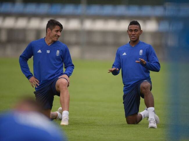 Bárcenas en su primer entrenamiento con el Oviedo, junto a Saúl Berjón / Real Oviedo