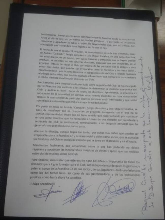 El comunicado parte con una disculpa de quienes deben asumir, con un sentido crítico pero no despectivo de esta afirmación, que se vulneraron principios y valores éticos que un club deportivo humilde como la Arandina no debiera despreciar. Las formas importan y la disculpa de quienes quisieron cesar a Jesús de Andrés 'Campilllo', Luis Miguel Catalina y Sergio González deben aparecer en este comunicado y debieran darse a nivel personal. Ennoblece a las personas, las dignifica: "El hecho de que el pasado 13 de junio , se comunicara el cese de tres directivos, Jesús de Andrés “Campillo”, Sergio González y Luis Miguel Catalina, en una junta directiva, sin aviso previo, es un suceso, por cuyas maneras y perjuicios que se hayan podido producir, se solicitan las más sinceras disculpas, disculpas que son aceptadas, en el principal interés de situar el Club por encima de las personas que lo dirigen y para evitar más daños que puedan ser irreparables para la Arandina y su masa social , manifestándose por la Junta Directiva el agradecimiento del Club a la labor realizada a lo largo de los años, que ha sido ajustada al buen hacer que siempre ha caracterizado al Club y siempre movidos por el interés del Club".