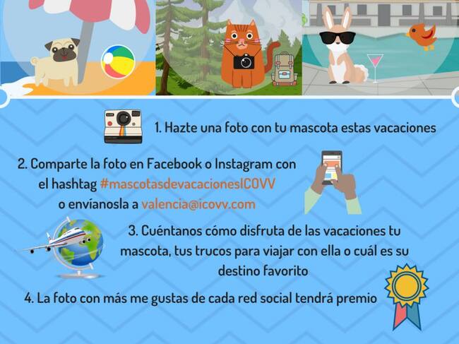 Si queréis participar podéis compartir vuestras fotos con la etiqueta #mascotasdevacacionesICOVV o también a través del correo electrónico valencia@icovv.com. Recordamos también que la campaña finalizará a mediados de septiembre y la foto más votada de cada red social recibirá un obsequio.
