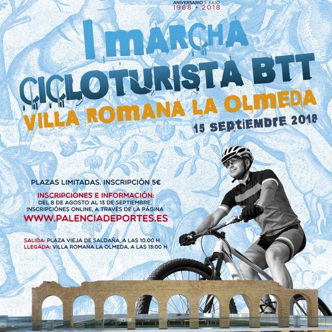 La I Marcha Cicloturista de BTT “Villa Romana La Olmeda”, con motivo del 50 aniversario del descubrimiento de la Villa, tendrá lugar el sábado 15 de septiembre, con salida en Saldaña y meta en el propio yacimiento. Con motivo del 50 aniversario del descubrimiento de la Villa Romana La Olmeda, tendrá lugar esta prueba deportiva, de marcado carácter popular.