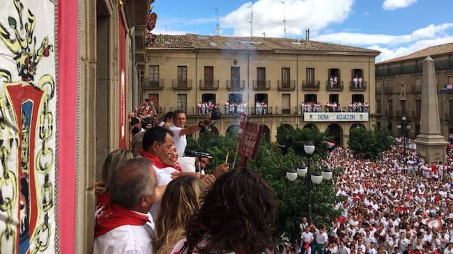 Un cohete sin presencia de ikurriña entre los mástiles del balcón del Ayuntamiento, como ya anunciaba en La SER, el alcalde de Tafalla, Arturo Goldaracena. En su lugar un mástil vacío. Y con presencia de multitud de representantes políticos como la presidenta del Gobierno de Navarra, Uxue Barkos.