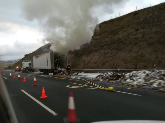 El remolque de un camión ha ardido esta mañana en la A-1, dirección a Vitoria entre Armiñón y La Puebla de Arganzón. El accidente se ha producido pasadas las siete de la mañana y ha obligado a los Bomberos a intervenir para sacar la carga lo más rápido posible y apagar el fuego.
