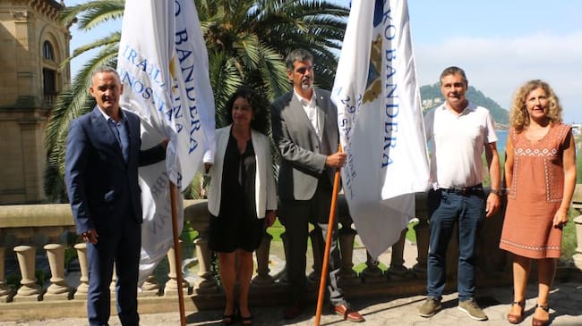 Los organizadores y patrocinadores de la Bandera de la Concha posan con los preciados 'trapos' / Donostiako Udala