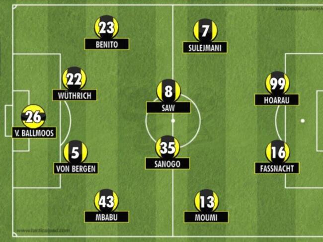 Once tipo: Von Ballmoos; Mbabu, Von Bergen, Wüthrich, Benito; Moumi Ngamaleu, Sanogo, Sow, Sulejmani; Hoarau, Fassnacht.