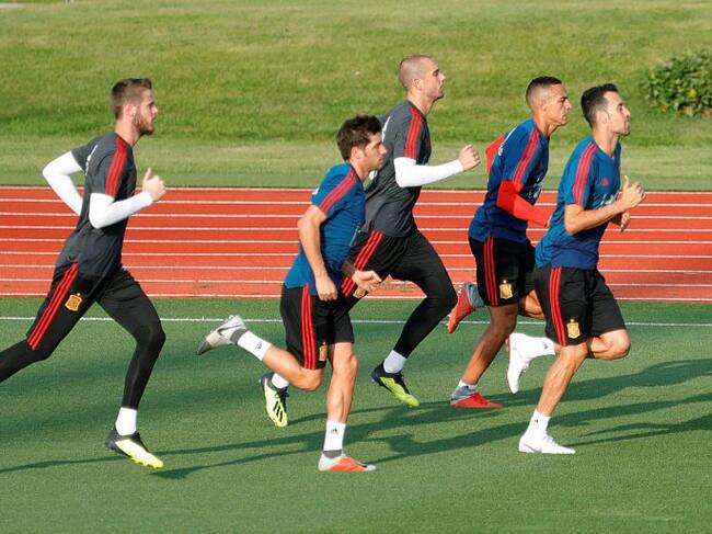GRAF5261. LAS ROZAS (MADRID).- Los porteros David De Gea (i) y Pau López (c), y los centrocampista Sergi Busquets (d) y Thiago Alcántara (2d), durante el entrenamiento de la selección hoy en Las Rozas (Madrid), para preparar los partidos de la Liga de Nac / JuanJo Martín (EFE)