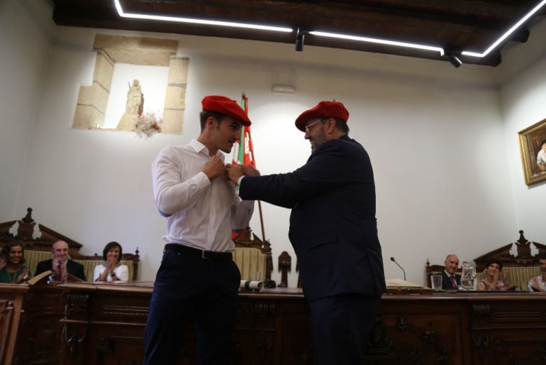El joven deportista hondarribiarra y reciente campeón de Europa de Trial Sin Ion Areitio Agirre recibe emocionado la Insignia de Oro de la Ciudad de Hondarribia de este año 2018