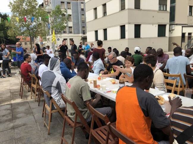 El barrio bilbaíno de Solokoetxe ha acogido este domingo un desayuno solidario para personas migrantes y refugiadas, una acción con la que La Red de Acogida de Bilbao, además de ofrecerles alimento, han demandado que las instituciones vascas y, en este caso de modo más concreto el Ayuntamiento de Bilbao, cubra las necesidades básicas de estas personas que actualmente vienen atendiendo los barrios y la ciudadanía bilbaína.