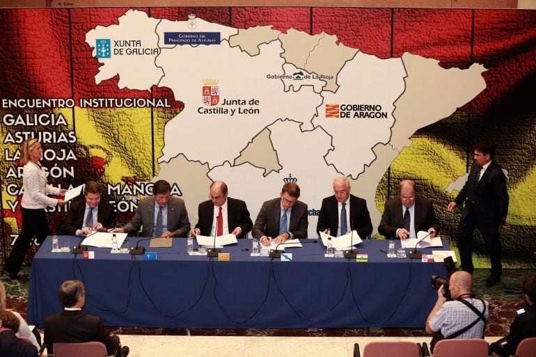Importante reunión con un claro carácter económico y social la que mantienen este lunes los presidentes de Castilla-La Mancha, Castilla-León, Aragón, Asturias, Galicia y La Rioja en Zaragoza. Todos han comparecido para explicar el contenido de la declaración institucional suscrita para pedir una reforma del sistema de financiación autonómica y de los fondos de la política de cohesión europea en lo concerniente a la despoblación.