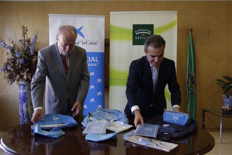 De nuevo, por quinto año consecutivo, se unen la Diputación de Sevilla y Caixabank para la campaña "yo seré lo que quiera ser". Se trata de ayudar en el arranque del curso escolar a familias vulnerables. Se les da un kit con diferentes elementos escolares para los 3 niveles. Infantil, primaria y secundaria. Hay 21 entidades que forman parte de esta iniciativa de protección a la infancia. Son más de 17.000 los equipos de material escolar básico. En el acto ha estado presentes Rafael Herrador, como responsable de la zona territorial de Andalucía Occidental de Caixabank. Una institución que reparte hasta 17.000 equipos de materia escolar básico para los tres ciclos educativos entre familias que presentan vulnerabilidad económica de la provincia sevillana, tanto en mayores como menores de 20 mil habitantes.