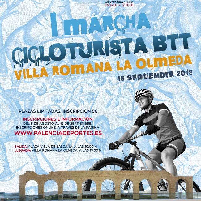 El deporte tiene también su protagonismo en los actos del 50 aniversario del descubrimiento de la Villa Romana La Olmeda. Con este objetivo, el Servicio de Deportes de la Diputación lleva tiempo trabajando en la Marcha de BTT “La Olmeda, que tendrá lugar el día 15 del próximo septiembre, con salida desde la Plaza Vieja de Saldaña a las 10 de la mañana y llegada en el propio yacimiento. Se recomienda a todos los participantes que vayan con tiempo suficiente, pudiendo recoger su dorsal desde las 9 de la mañana en el Ayuntamiento de Saldaña.