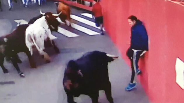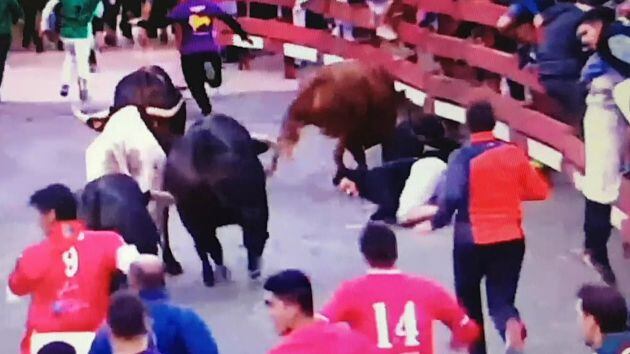 Momento de la cogida de un joven de 20 años antes de entrar a la plaza. / CAPTURA IMAGEN GUADATV