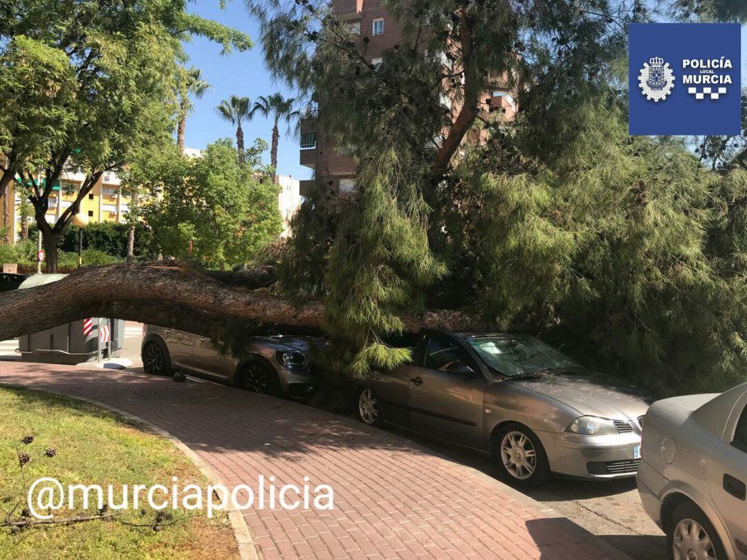 La Policía Local de Murcia ha tenido que cortar el tráfico en la confluencia de las calles Sauce con Juan Ramón Jiménez, en el barrio del Infante debido a la caída de un árbol de grandes dimensiones sobre dos vehículos que estaban estacionados bajo él.