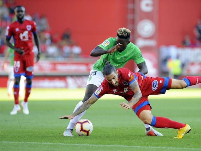 Marc Mateu cae ante la presencia de Eteki. / laliga.es