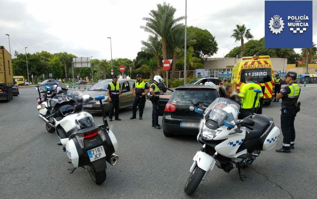 Agentes de la Policía Local de Murcia han detenido al conductor de un turismo que se ha visto implicado en una colisión en la avenida de Los Dolores en la rotonda del MediaMarkt.