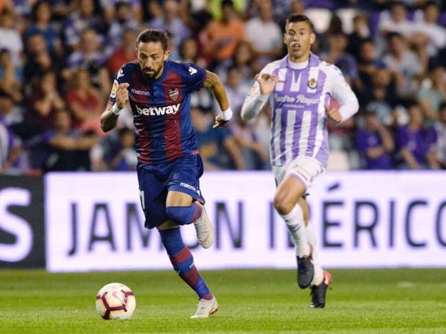 GRAF4502. VALLADOLID, El centrocampista del Levante UD, José Luis Morales (i), se escapa del jugador del Real Valladolid, durante el partido perteneciente a la sexta jornada de la Liga en Primera División que se juega esta noche en el estadio José Zorrill / NACHO GALLEGO (EFE)