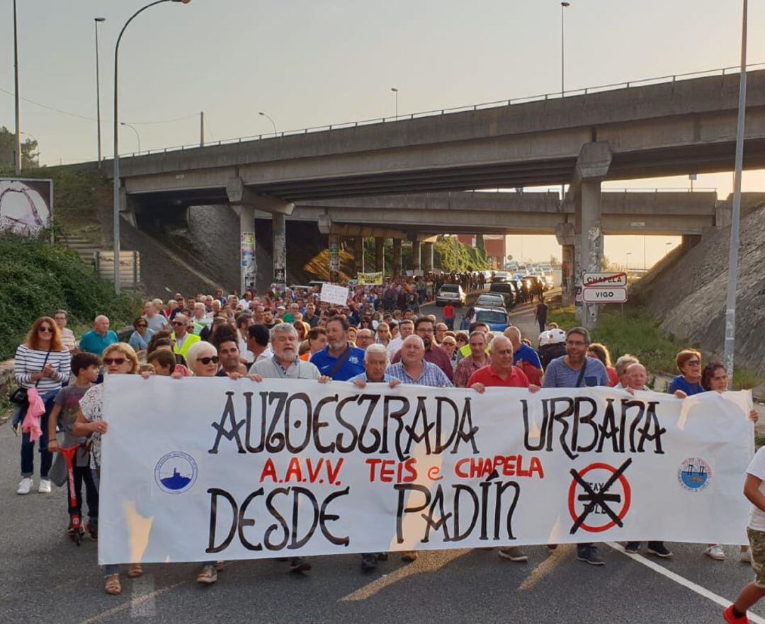 Cerca de medio millar de vecinos de Teis y Chapela se manifestaron ayer por la tarde para pedir el cese inmediato del peaje de Rande, además de protestar por la contaminación acústica que sufren los que viven cerca de la autopista y para que se convierta en tramo urbano el tramo de Teis de acceso de la autopista.