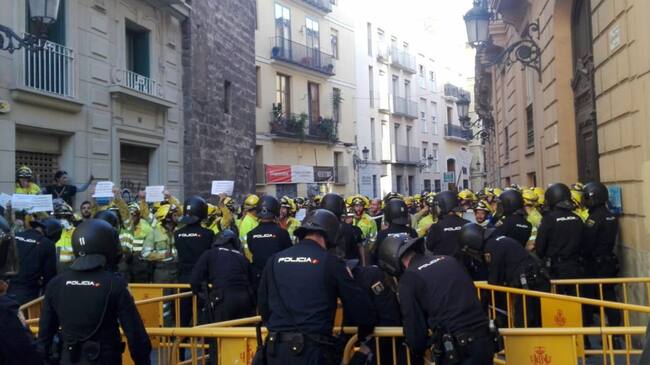 Desde las 9 de la mañana, varios centenares de bomberos forestales se manifiestan frente al Palau de la Generalitat, reclamando la equiparación de sus derechos laborales y salariales.