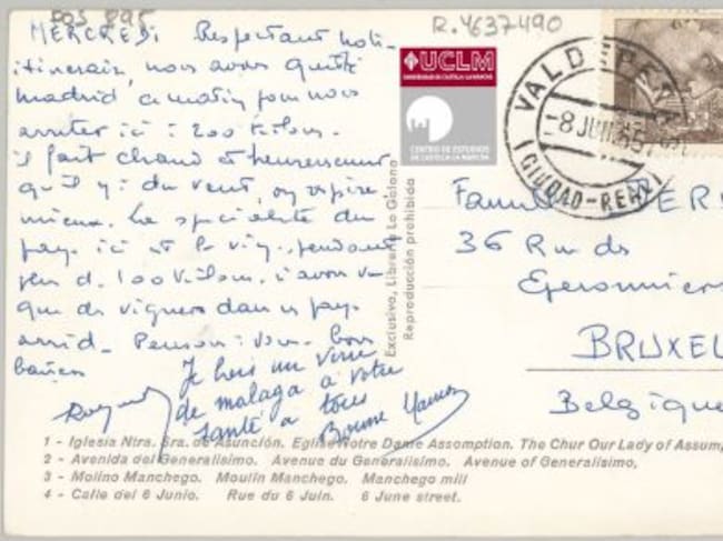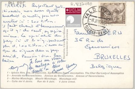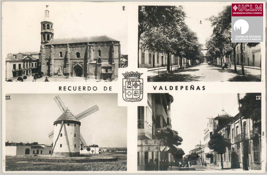 La Iglesia "Nuestra señora de la Asunción", la entonces Avenida del Generalísimo, la Calle del 6 de junio y un molino manchego -hoy dedicado a Gregorio Prieto- para situar a la localidad de cara al exterior, formaban parte de una postal, de las denominadas multivista, recuerdo de Valdepeñas y que en el año 1965 fue enviada hacia Bruselas por un grupo de turistas que se encontraba conociendo esta localidad que ya en aquel tiempo vivía un movimiento en defensa del vino, con la creación a mediados de esta década del Centro de Promoción del Vino para difundir y poner en valor los caldos de Valdepeñas.