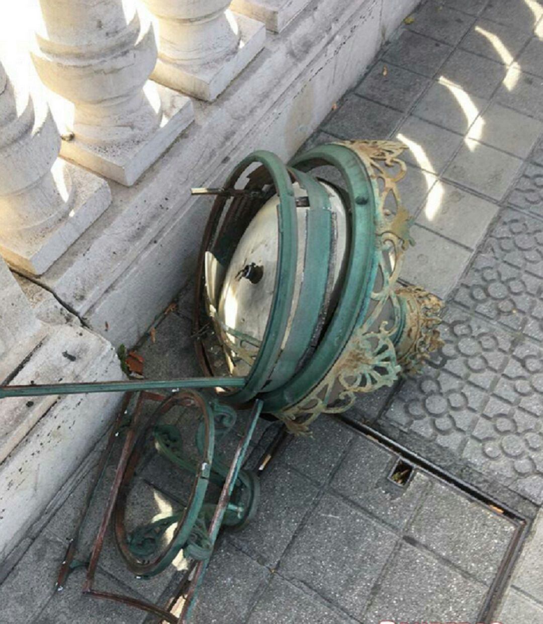 Los efectivos municipales están trabajando en la zona para retirar y asegurar la farola. Al parecer, las rachas de viento que soplan durante este viernes, habrían provocado el derribo de la parte alta de la corona de hierro forjado.