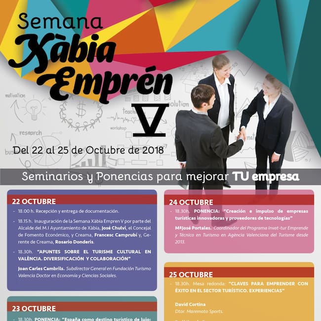 Del 22 al 25 de octubre, la concejal´lia de Fomento Económico del Ayuntamiento xabiero ha organizado la V edición de las jornadas Xàbia Emprèn, un ciclo de conferencias y espacio de intercambio de experiencias que pretenden promover y reforzar el ambiente de emprendimiento y alentar la creatividad y la innovación.