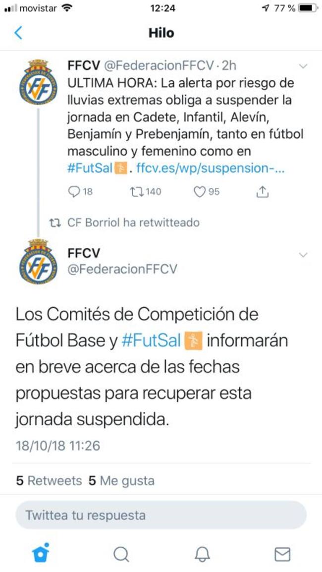 La alerta meteorológica decretada por la Generalitat Valenciana y la prudencia aconsejable en estos casos han movido a la Federación de Fútbol de la Comunidad Valenciana a suspender la próxima jornada de competición en las categorías Cadete, Infantil, Alevín, Benjamín y Prebenjamín de fútbol y fútbol sala masculino y femenino, incluyéndose en dicha suspensión los encuentros adelantados al día de hoy, jueves 18 de octubre, así como los de mañana viernes y el fin de semana. Dadas las recomendaciones de la Administración autonómica y los avisos del Centro de Coordinación de Emergencias de la Generalitat Valenciana ante la previsión de temporal de lluvias extremas a nivel local, la FFCV considera que esta medida es la más aconsejable y apela al sentido común de los clubes que participan en el resto de categorías para aplicar la prudencia a la hora de realizar desplazamientos”.