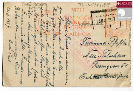 La postal se dirigió hacia una ciudad de la desaparecida Checoslovaquia, probablemente por parte de una persona relacionada con la mina. Fue escrita en alemán el 23 de marzo, sellada el 25 en Puertollano y que llegó a Valencia dos días después con el sello de la censura militar, explica Esther Almarcha, directora del Centro de Estudios de Castilla-La Mancha que describe las características del edificio que junto con el kiosko de la Fuente Agria han permanecido como elementos singulares del patrimonio de Puertollano.