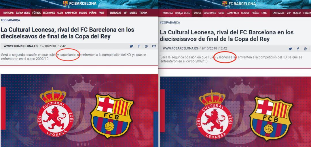 Minutos después del sorteo de Copa del Rey, la WEB oficial del Futbol Club Barcelona llevaba a su portada el enfrentamiento con la Cultural Leonesa. Sin embargo, la presencia estelar del escudo leonés en la primera plana de la web culé quedaba empañada por la denominación como equipo 'castellano' del club leonés. Eso sí, tras las primeras reacciones en las redes sociales, el club blaugrana salió de su error y corrigió su WEB en la que figura ya, de manera correcta, que el Barça se enfrentará a 'los leoneses' en la nueva eliminatoria de la Copa del Rey de fútbol.