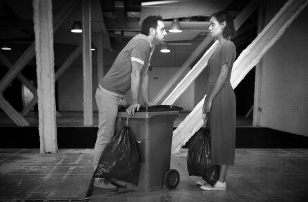 El simple acto cotidiano de bajar la basura al contenedor es el nexo de unión de los dos personajes que protagonizan ‘Al anochecer’. Una pieza de dos personajes sin nombre -Él y Ella- interpretados por Pablo Díaz del Río y Helena Font, bajo la dirección de Sergio Caballero. Al anochecer’ es tan simple y tan complicada como una tierna historia de amor y de humor.