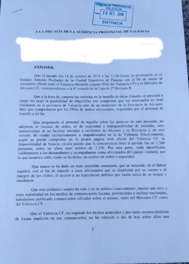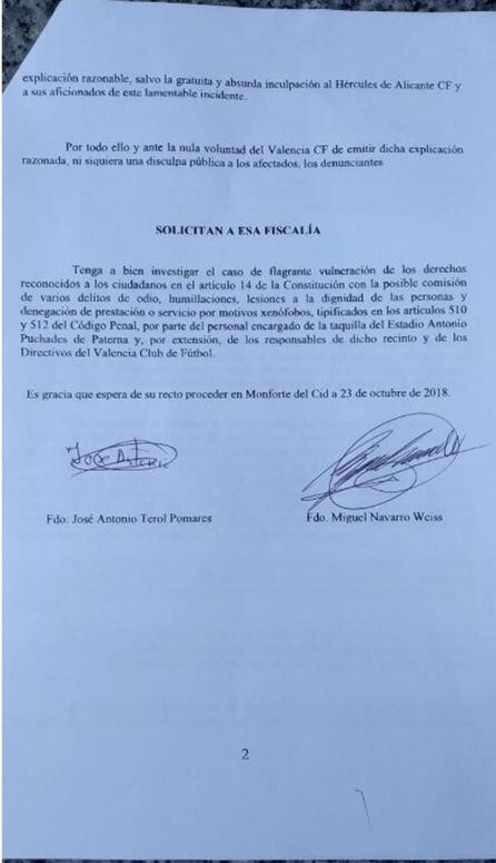 Dos aficionados del Hércules CF, José Antonio Terol y Miguel Navarro, residentes en la localidad de Aspe, han presentado esta mañana, en los Juzgados de Valencia y ante la Fiscalía de la Audiencia Provincial, una denuncia por los hechos acaecidos en las taquillas de la Ciudad Deportiva del Valencia, el pasado 14 de octubre.