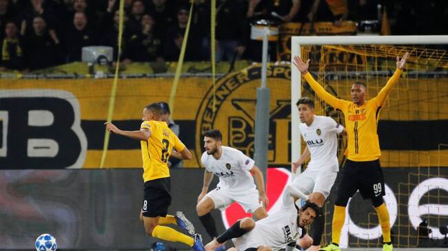 Soccer Football - Champions League - Group Stage - Group H - BSC Young Boys v Valencia - Stade de Suisse, Bern, Switzerland - October 23, 2018 Young Boys are awarded a penalty by referee Andris Treimanis after Young Boys' Djibril Sow is fouled by Valenci / STEFAN WERMUTH (Reuters)