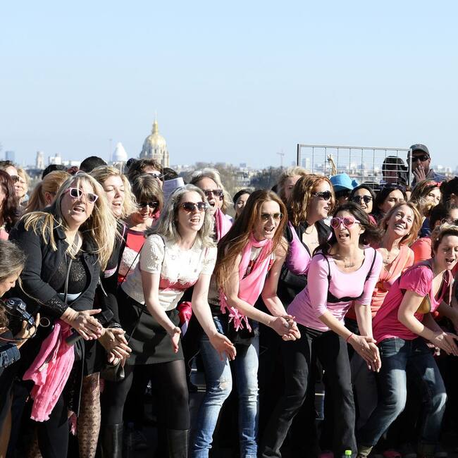 Varias mujeres participan en París (Francia) en un acto sobre el cáncer de mama. / ozens of women get ready to throw their bras in the air during the 5th edition of the rally organized by Pink Bra Bazaar, a charitable organization dedicated to the education for breast health and support of women with breast cancer, on March 15, 2014 in Paris. AFP PHOTO / FRANCK FIFE (Photo credit should read FRANCK FIFE/AFP/Getty Images