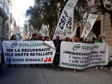 Por otro lado, una treintena de trabajadores y representantes del sindicato CSIF se ha concentrado frente a la conselleria de Hacienda para reclamar una serie de derechos perdidos en la función pública como el cumplimiento de 35 horas semanales en sanidad o 18 horas lectivas en educación, entre otros.