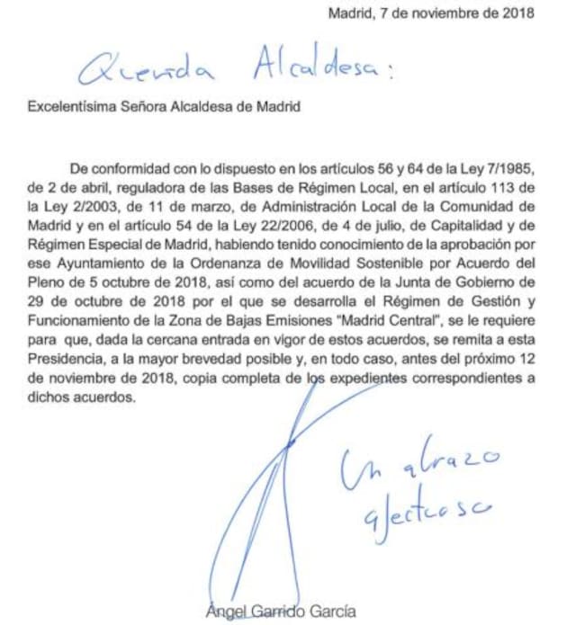 En la carta que el Presidente ha enviado a la alcaldesa de Madrid, también solicita los expedientes del acuerdo de Pleno del 5 de octubre de 2018, donde salió adelante la Ordenanza de Movilidad Sostenible, como el de la Junta de Gobierno del 29 de octubre, por el que se desarrolla el Régimen de Gestión y Funcionamiento de la Zona de Bajas Emisiones Madrid Central.