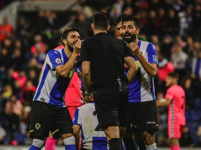 Carlos Martínez y Diego Benito conversan con el colegiado / Hércules CF